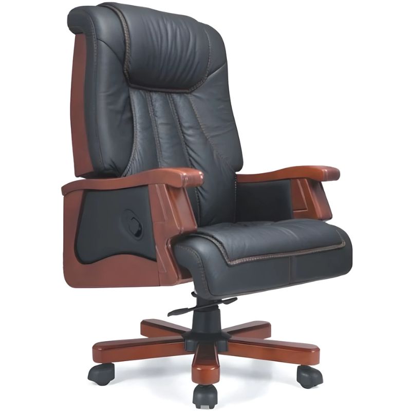 Ghế da giám đốc nhập khẩu DSG15 sở hữu thiết kế cổ điển nhưng không kém phần hiện đại, mang đến vẻ đẹp hiện đại sang trọng và mạnh mẽ. Với kích thước tiêu chuẩn rộng 800 x sâu 740 x cao 1240-1300 mm, ghế được thiết kế tạo cảm giác bề thế, phù hợp với nhiều không gian văn phòng lãnh đạo. Thiết kế tựa lưng cao được ốp khung gỗ tự nhiên, kết hợp da bọc dày và các đường chỉ may tinh tế tạo điểm nhấn đẳng cấp. Tay vịn dạng hộp chắc chắn, bọc da kết hợp gỗ, mang lại sự thoải mái mà không gây vướng víu khi làm việc.